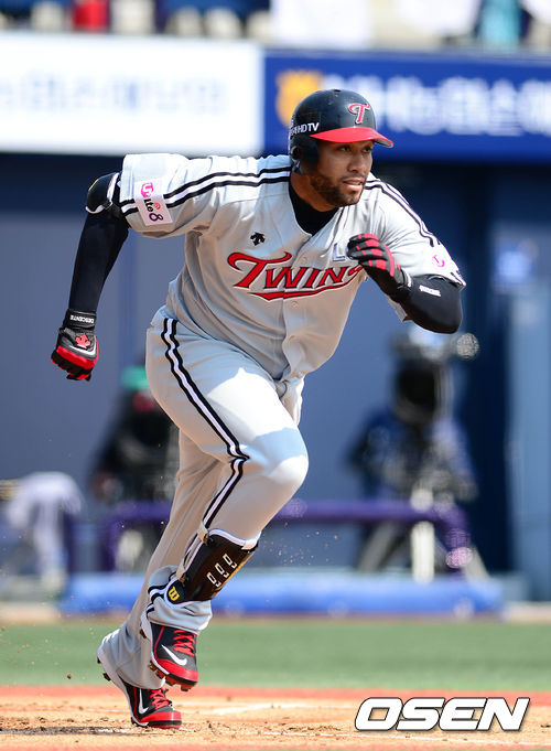 11일 오후 창원 마산야구장에서 열린 '2014 한국야쿠르트 세븐 프로야구' 시범경기 NC 다이노스와 LG 트윈스의 경기, 2회초 LG 벨이 내야땅볼을 치고 그라운드를 달리고 있다.