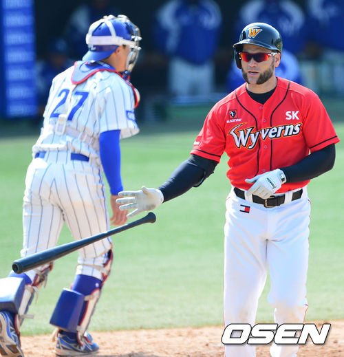 3회초 SK 공격 2사 1, 3루 상황 스캇이 볼넷으로 출루하고 있다.