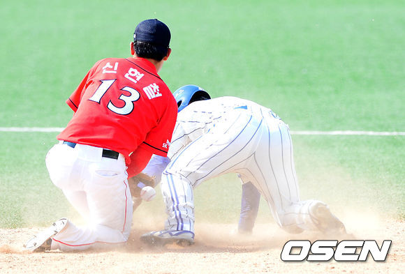 3회말 삼성 공격 1사 1루 상황 주자 이상훈의 2루 도루 때 SK 유격수 신현철이 태그를 시도하다 공을 떨어뜨리고 있다. 주자 이상훈은 세이프.
