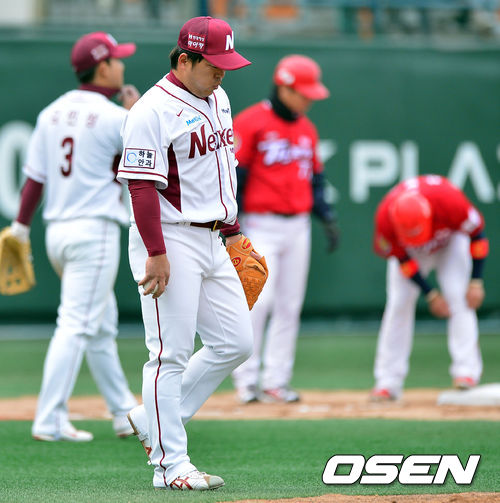 11일 서울 목동구장에서 열린 '2014 프로야구 시범경기' 넥센 히어로즈와 KIA 타이거즈의 경기 3회초 2사 무사 만루 KIA 김주찬의 내야땅볼때 포수 실책으로 아웃카운트 하나만 잡은 넥센 마정길이 아쉬워하고 있다.