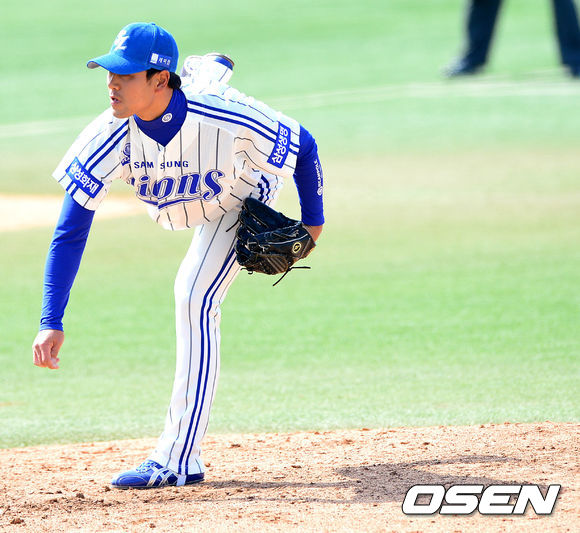 4회초 SK 공격 때 마운드에 오른 삼성 투수 김희걸이 힘차게 공을 뿌리고 있다.