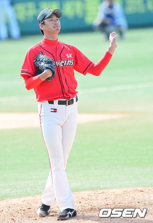 4회말 삼성 공격 2사 3루 상황 이정식에게 볼넷을 내준 SK 선발 김광현이 아쉬워하고 있다.