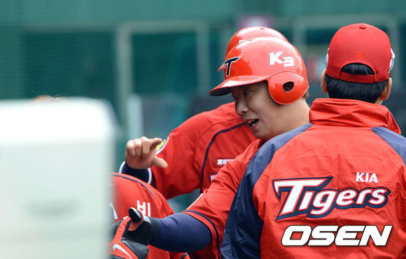 11일 서울 목동구장에서 열린 '2014 프로야구 시범경기' 넥센 히어로즈와 KIA 타이거즈의 경기 5회초 2사 1루 KIA 나지완이 2점 홈런을 날린후 동료들의 축하를 받고 있다.