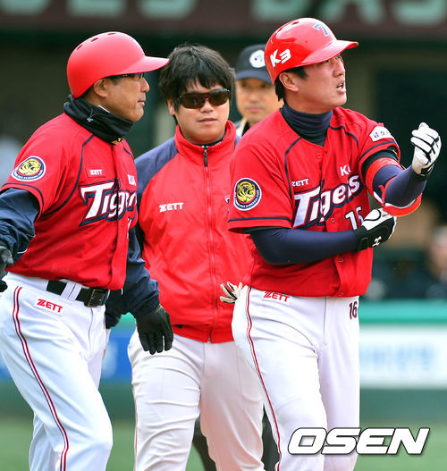 11일 서울 목동구장에서 열린 '2014 프로야구 시범경기' 넥센 히어로즈와 KIA 타이거즈의 경기 5회초 1사 1루 KIA 김주찬이 넥센 이상민의 투구에 맞은 후 고통스러워하고 있다
