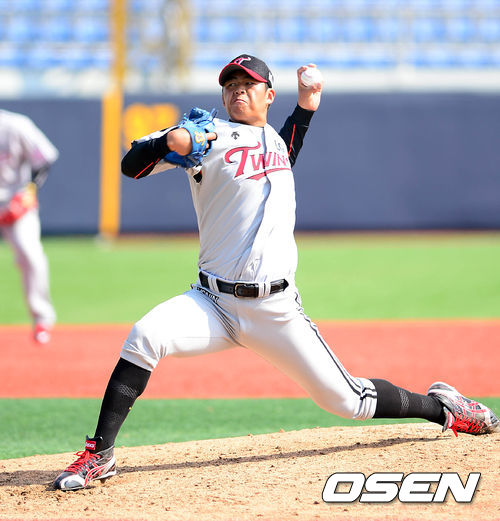 11일 오후 창원 마산야구장에서 열린 '2014 한국야쿠르트 세븐 프로야구' 시범경기 NC 다이노스와 LG 트윈스의 경기, 5회말 LG 임지섭이 힘차게 공을 던지고 있다.