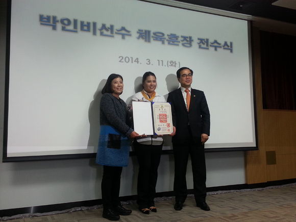 박인비가 명예로운 체육훈장을 받았다. 김종 문화체육관광부(이하 문체부) 제2차관은 11일 오후 서울 종로구 대한민국 역사박물관 6층에서 골프를 통해 국위 선양에 크게 기여한 박인비(26, KB금융그룹)에게 체육훈장 맹호장(2등급)을 전수하고 격려했다.