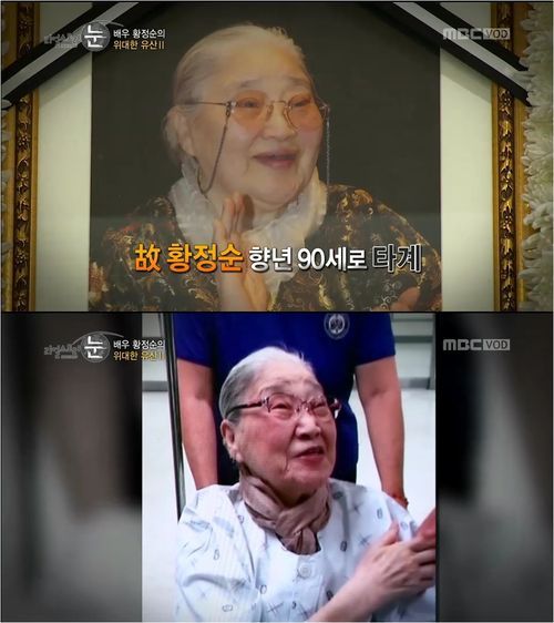 MBC 시사프로그램 ‘리얼스토리 눈’은 지난 10일 방송에서 고 황정순의 사망 후 세 명의 양자와 양녀가 유산을 둘러싸고 다투고 있는 뒷이야기를 공개했다.