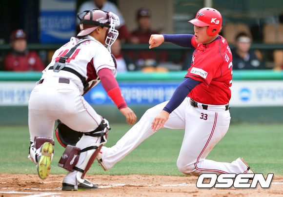11일 서울 목동구장에서 열린 '2014 프로야구 시범경기' 넥센 히어로즈와 KIA 타이거즈의 경기 6회초 무사 2루 KIA 안치홍의 1타점 적시타때 2루 주자 김주형이 홈쇄도하고 있다.