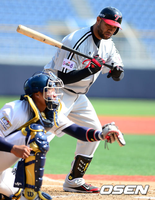 11일 오후 창원 마산야구장에서 열린 '2014 한국야쿠르트 세븐 프로야구' 시범경기 NC 다이노스와 LG 트윈스의 경기, 6회초 2사 1루에서 LG 벨이 볼넷으로 출루하고 있다.