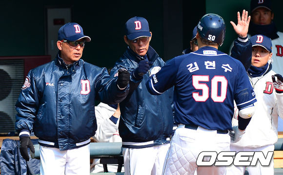 6회초 두산 김현수가 솔로홈런을 때린 뒤 송일수 감독과 기뻐하고 있다.