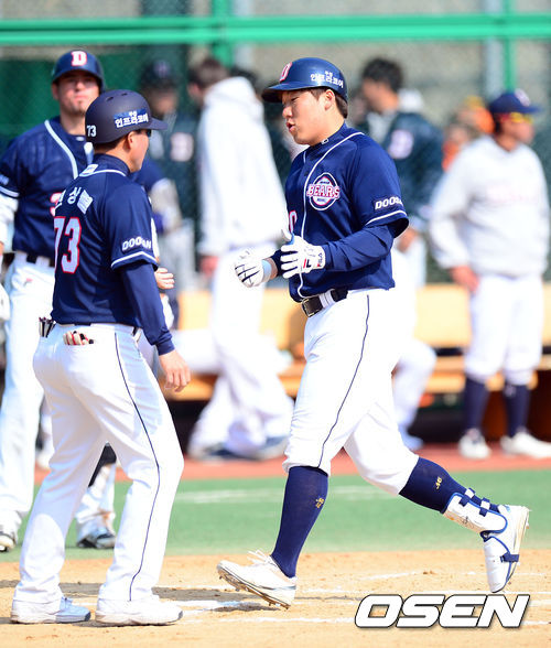 6회초 두산 김현수가 솔로홈런을 때린 뒤 홈으로 들어고 있다.