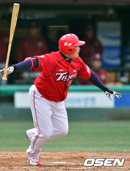 11일 서울 목동구장에서 열린 '2014 프로야구 시범경기' 넥센 히어로즈와 KIA 타이거즈의 경기 6회초 2사 2루 KIA 이종환이 1타점 적시타를 날리고 있다.
