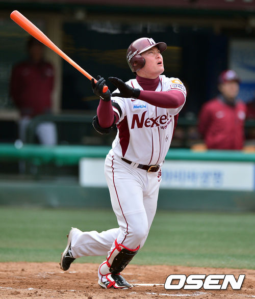 11일 서울 목동구장에서 열린 '2014 프로야구 시범경기' 넥센 히어로즈와 KIA 타이거즈의 경기 6회말 2사 넥센 이성열이 솔로홈런을 날리고 있다