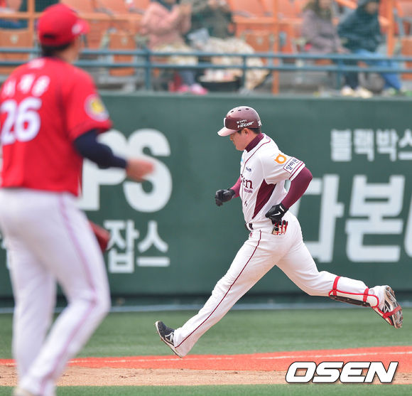 11일 서울 목동구장에서 열린 '2014 프로야구 시범경기' 넥센 히어로즈와 KIA 타이거즈의 경기 6회말 2사 넥센 이성열이 솔로홈런을 날리고 베이스를 돌고 있다