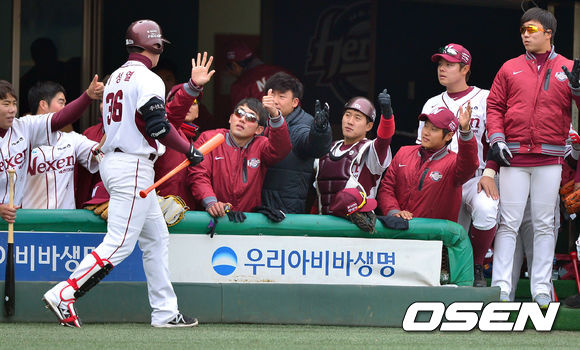 11일 서울 목동구장에서 열린 '2014 프로야구 시범경기' 넥센 히어로즈와 KIA 타이거즈의 경기 6회말 2사 넥센 이성열이 솔로홈런을 날리고 동료들의 축하를 받고 있다