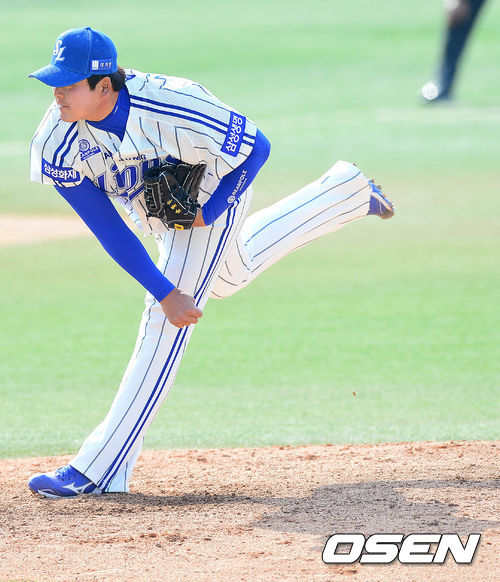 7회초 SK 공격 삼성 투수 김현우가 힘차게 공을 뿌리고 있다.