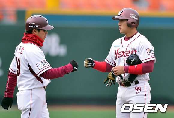 11일 서울 목동구장에서 열린 '2014 프로야구 시범경기' 넥센 히어로즈와 KIA 타이거즈의 경기 6회말 2사 넥센 임태준이 역전 1타점 적시타를 날린 후 최만호 코치와 하이파이브를 하고 있다