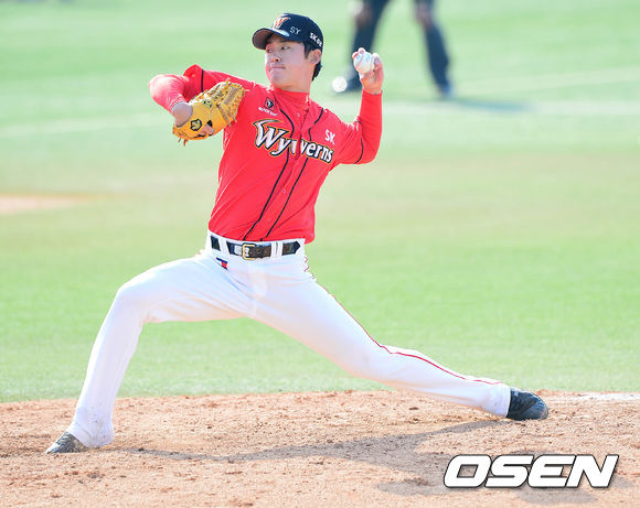 8회말 마운드에 오른 SK 투수 진해수가 힘차게 공을 뿌리고 있다.