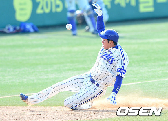 8회말 삼성 공격 2사 1루 상황 대타 우동균의 우전 안타 때 1루 주자 차화준이 3루까지 내달려 세이프되고 있다.