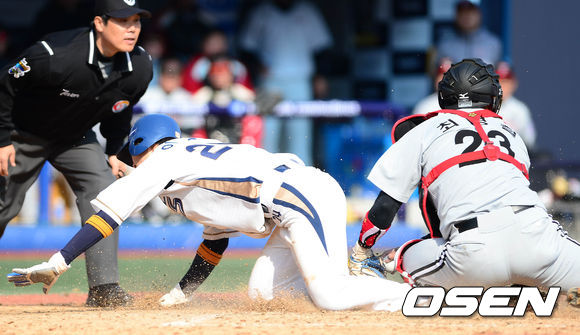 7회말 2사 1,2루에서 NC 나성범의 우전 적시타 때 2루주자 이상호가 홈에서 세이프 되고 있다./sunday@osen.co.kr
