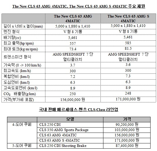 메르세데스-벤츠The New CLS 63 AMG 4MATIC과 The New CLS 63 AMG S 4MATIC의 국내 출시로 CLS-Class의 라인업은 4-도어 쿠페 CLS 250 CDI, CLS 350 AMG Sports Package, CLS 63 AMG 4MATIC, CLS 63 AMG S 4MATIC 및 5-도어 쿠페 CLS 250 CDI Shooting Brake로 확대되었으며 가솔린, 디젤뿐만 아니라 4MATIC 모델까지 추가 돼 국내 소비자들의 니즈에 맞는 다양한 라인업을 제공하게 되었다.