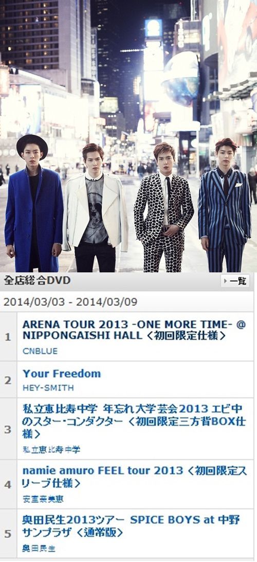 일본 타워레코드에 따르면 씨엔블루 2013 아레나투어 ‘원 모어 타임(ONE MORE TIME)’ DVD는 발매 첫 주 종합 차트 1위에 등극했다. 이 DVD는 지난 5일 발매와 동시에 오리콘 일간 차트 1위를 차지하기도 했다.
