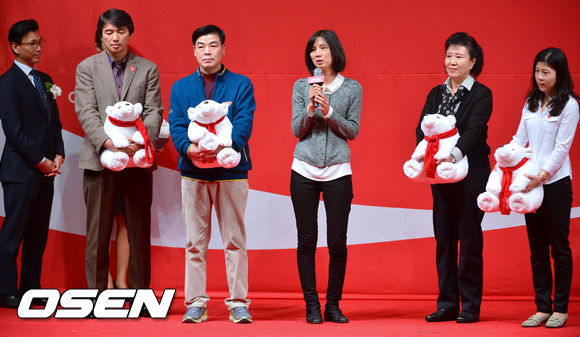 12일 서울 소공동 웨스틴 조선호텔에서 진행된 제19회 코카콜라 체육대상 시상식에서 우수단체상을 수상한 쇼트트랙 여자대표팀 선수들의 가족들이 수상 소감을 말하고 있다. 쇼트트랙 여자대표팀은 오는 14일부터 캐나다에서 열리는 세계선수권대회 차 이날 시상식에 불참했다.