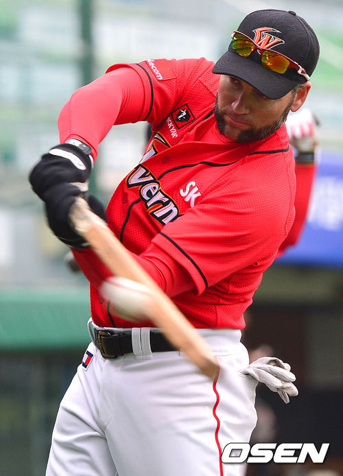 12일 오전 대전 한밭야구장에서 열리는 '2014 프로야구 시범경기' 삼성 라이온즈와 SK 와이번스의 경기를 앞두고, SK 스캇이 각목으로 타격 연습을 하고 있다.
