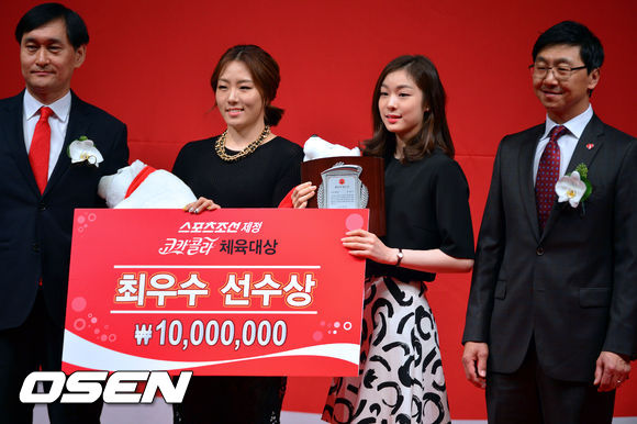 김연아와 이상화가 최우수선수상을, 박승희가 우수선수상, 스피드스케이팅 남자추월팀(이승훈, 주형준, 김철민)과 쇼트트랙 여자대표팀(조해리, 박승희, 박아랑, 공상정, 심석희)이 우수단체상, 최재우와 심석희가 신인상을 수상했다./ soul1014@osen.co.kr