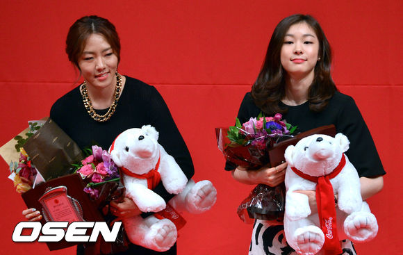 12일 서울 소공동 웨스틴 조선호텔에서 진행된 제19회 코카콜라 체육대상 시상식에서 최우수선수상을 공동수상한 이상화-김연아가 팬들에게 인사를 하고 있다