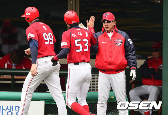 1회초 1사 1,2루에서 KIA 나지완의 선제 2타점 좌중간 2루타에 홈을 밟은 필, 이대형이 한대화 코치와 더그아웃에서 하이파이브를 하고 있다.