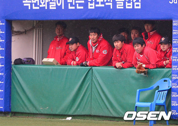 SK 선수들이 비오는 그라운드를 바라보고 있다.
