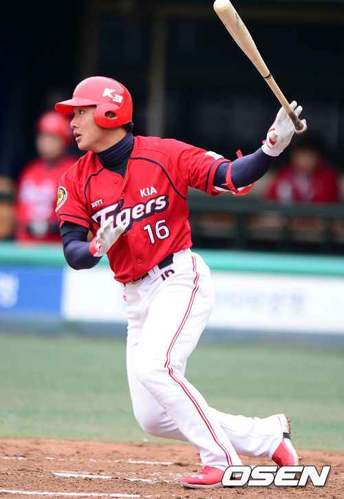 3회초 1사에서 KIA 김주찬이 시범경기 첫 안타를 날리고 있다.