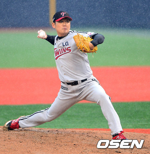 LG 베테랑 우투수 김선우가 이적 후 첫 공식경기에 나왔지만 경기 도중 내린 비로 예정된 투구수를 소화하지 못했다.