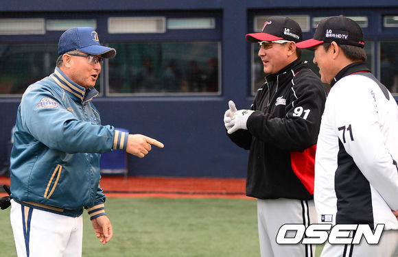 NC 김경문 감독이 LG 김기태 감독, 조계현 코치와 이야기를 나누고 있다./sunday@osen.co.kr