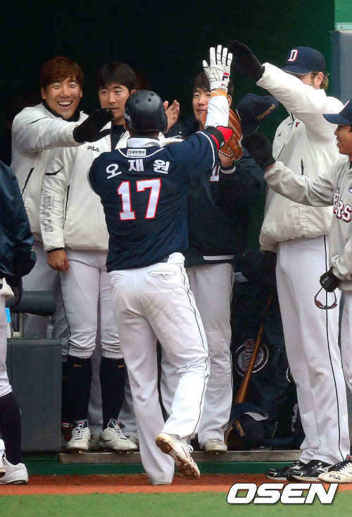 2회초 두산 오재원이 솔로 홈런을 때린 뒤 동료들과 기뻐하고 있다.