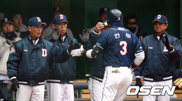 1회초 1사 1루 두산 송일수 감독이 2점 홈런을 때린 칸투와 하이파이브를 하고 있다.