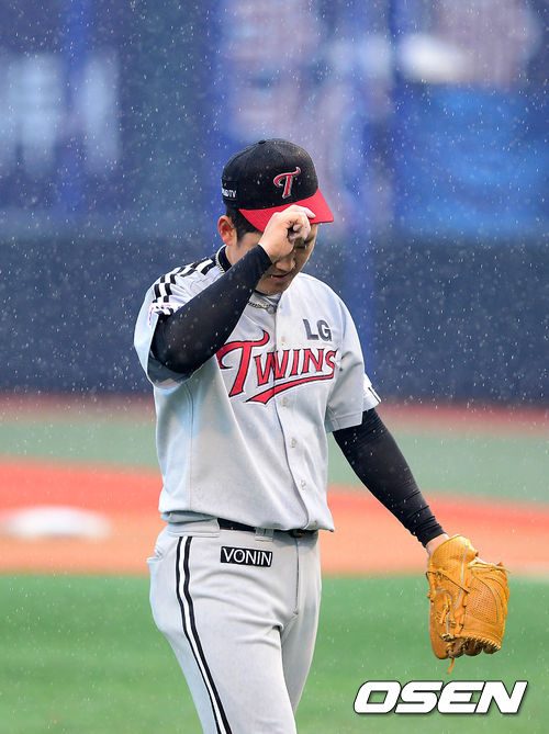 2회 우천으로 경기가 취소되자 LG 선발투수 김선우가 더그아웃으로 가고 있다./sunday@osen.co.kr
