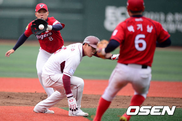 7회말 1사 2루에서 넥센 김지수가 이성열의 투수앞 땅볼에 협살에 걸려 태그를 피하고 있다.