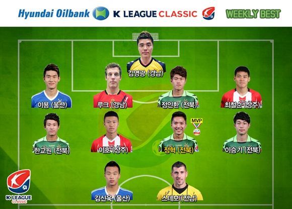 공격수 부문에는 스테보(전남, 노란 유니폼을 입고 K리그로 복귀하며 강호 서울을 꺾은 승리의 원동력)와 김신욱(울산, 지난해 포항전 복수혈전에 해결사 역할을 수행하며 존재감을 빛냄. 1득점)이 선정됐다.