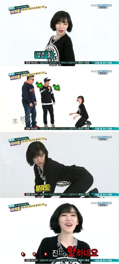 가인은 12일 방송된 MBC에브리원 예능프로그램 ‘주간아이돌’에서 “같은 춤을 춰도 나르샤 언니와 내가 하면 더 야하다”고 말했다.