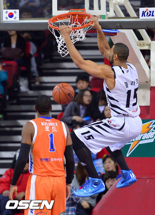 12일 오후 인천 삼산월드체육관에서 열린 '2013-2014 KB국민카드 프로농구' 6강 플레이오프 1차전 경기, 1쿼터 KT 클라크가 덩크슛을 성공시키고 있다.