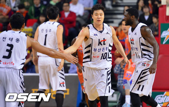 12일 오후 인천 삼산월드체육관에서 열린 '2013-2014 KB국민카드 프로농구' 6강 플레이오프 1차전 경기, 2쿼터 KT 조성민이 2점슛 성공후 전태풍과 하이파이브를 하고 있다