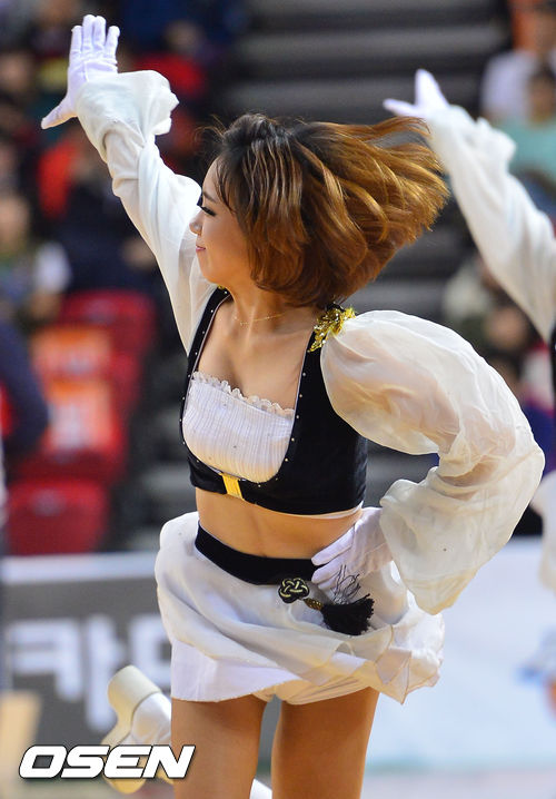 12일 오후 인천 삼산월드체육관에서 열린 '2013-2014 KB국민카드 프로농구' 6강 플레이오프 1차전 경기, 작전타임때 전자랜드 치어리더가 멋진 무대를 펼치고 있다.