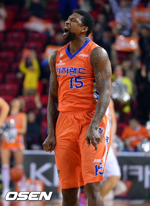 12일 오후 인천 삼산월드체육관에서 열린 '2013-2014 KB국민카드 프로농구' 6강 플레이오프 1차전 경기, 3쿼터 전자랜드 포웰이 덩크슛을 성공시킨후 환호하고 있다.