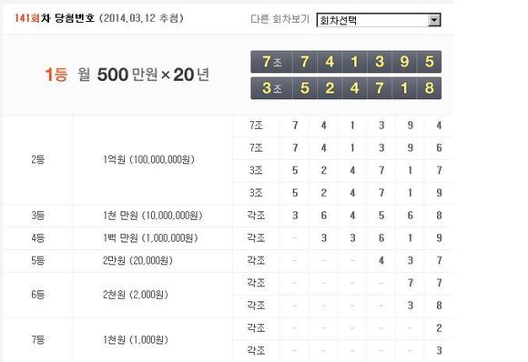 12일 추첨된 연금복권141회 당첨번호가 '7조 741395'-'3조 524718'로 확정됐다. 1등에게는 20년 동안 매달 500만 원의 당첨금이 분할 지급된다. 1등은 22%의 세금을 떼고 390만 원 정도의 실수령액을 받는다.