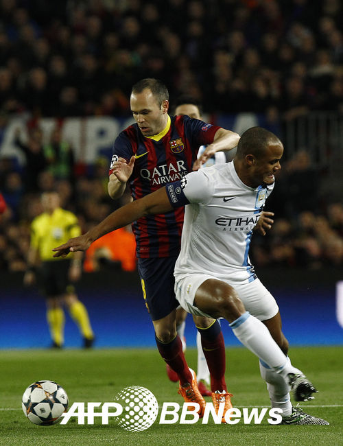 안드레스 이니에스타(바르셀로나)와 빈센트 콤파니(맨시티)가 공을 차지하기 위해 몸싸움을 벌이고 있다.