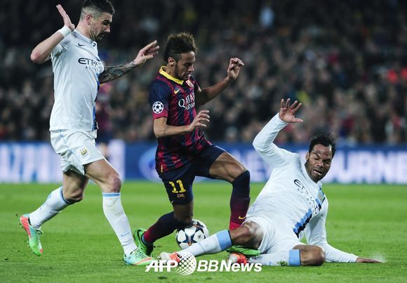 네이마르(바르셀로나)가 제임스 밀너, 졸리온 레스콧(이상 맨시티)의 수비를 뚫고 드리블하고 있다.