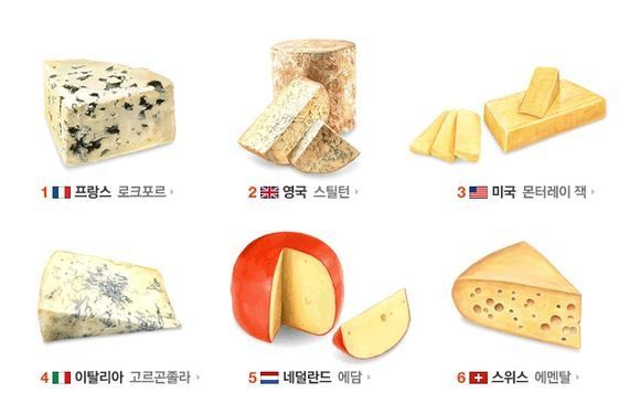 치즈의 종류 인포그래픽에 따르면 프랑스 치즈로는 '세계 3대 치즈'로 불리는 로크포르를 비롯해 브리 치즈, 블루 치즈, 카망베르 치즈, 리바로, 콩테가 있고, 신사의 나라 영국에서는 스틸턴, 하우다 치즈, 체더 치즈가 있다.