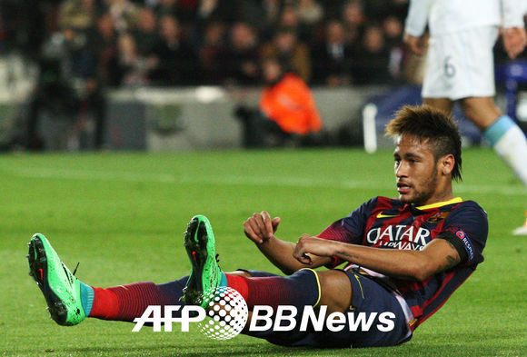 [OSEN=스포츠부] 바르셀로나의 공격수 네이마르가 맨체스터 시티(이하 맨시티)의 골문을 향해 침투하다 넘어져 아쉬워하고 있다.